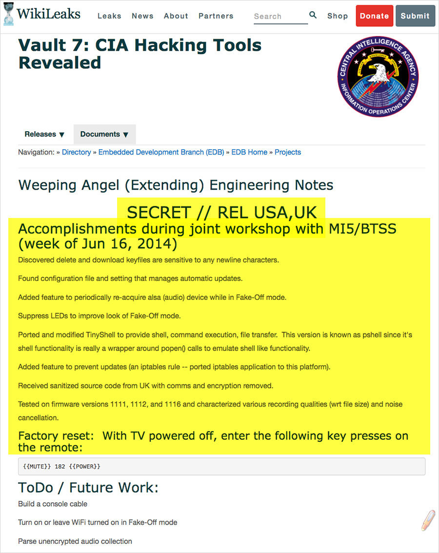 Moreover, the CIA's Embedded Devices Branch (EDB) and the British MI5/BTSS agencies have developed a program called "Weeping Angel" which can penetrate smart TVs and turn them into covert microphones that listen in on conversations held at home.